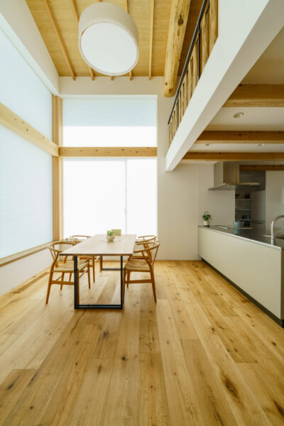 こちらの写真は「鳥屋野南モデルハウス」の写真です。リビング・ダイニングの開口部からキッチンの開口部へと南北に風が抜けるように、