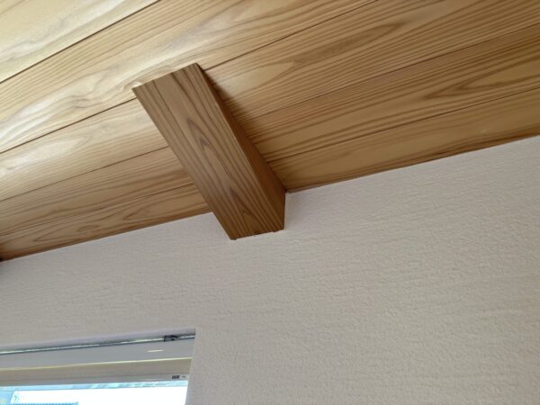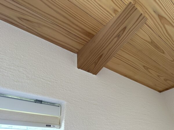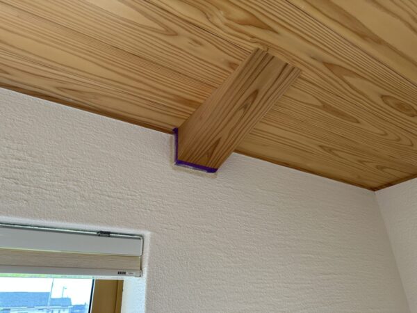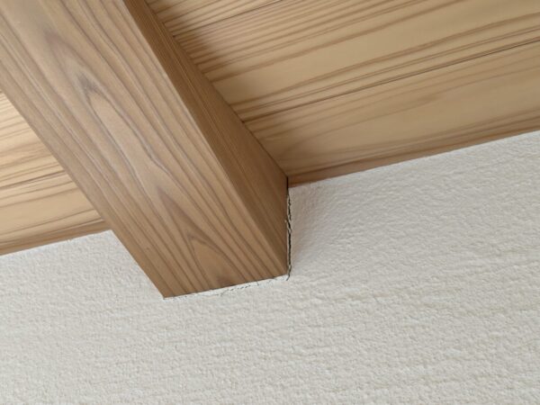 写真を見ると木材と漆喰壁の間に隙間が空いているのが分かるかと思います。築2年くらいまでは竣工当初の木材から水分が抜けて乾燥収縮により木材が少し痩せて隙間が空いてきてしまいます。この隙間を漆喰で補修することで新築時の輝きを簡単に取り戻すことができます。