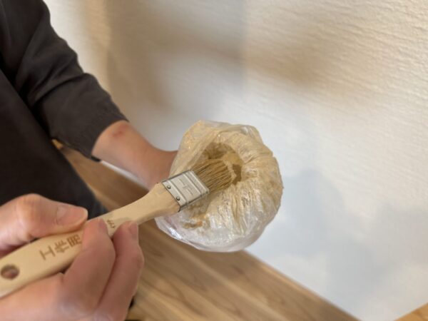 実際に塗っていきます。ポイントは隙間に漆喰を入れ込むように塗っていき、そのあとに刷毛に少量の水をつけて伸ばしていくように塗っていきます。