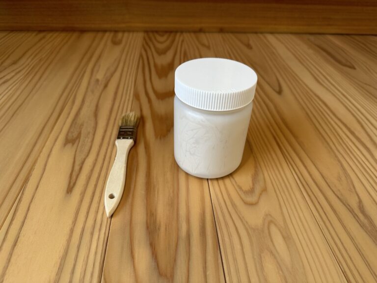 その次にマスキングテープを使って木材を養生(保護)し、漆喰を塗っていきます。ちなみに漆喰の中身は粘り気のあるペースト状をしています。色はクリーム色ですが乾くと白くなるので安心して塗ってください。