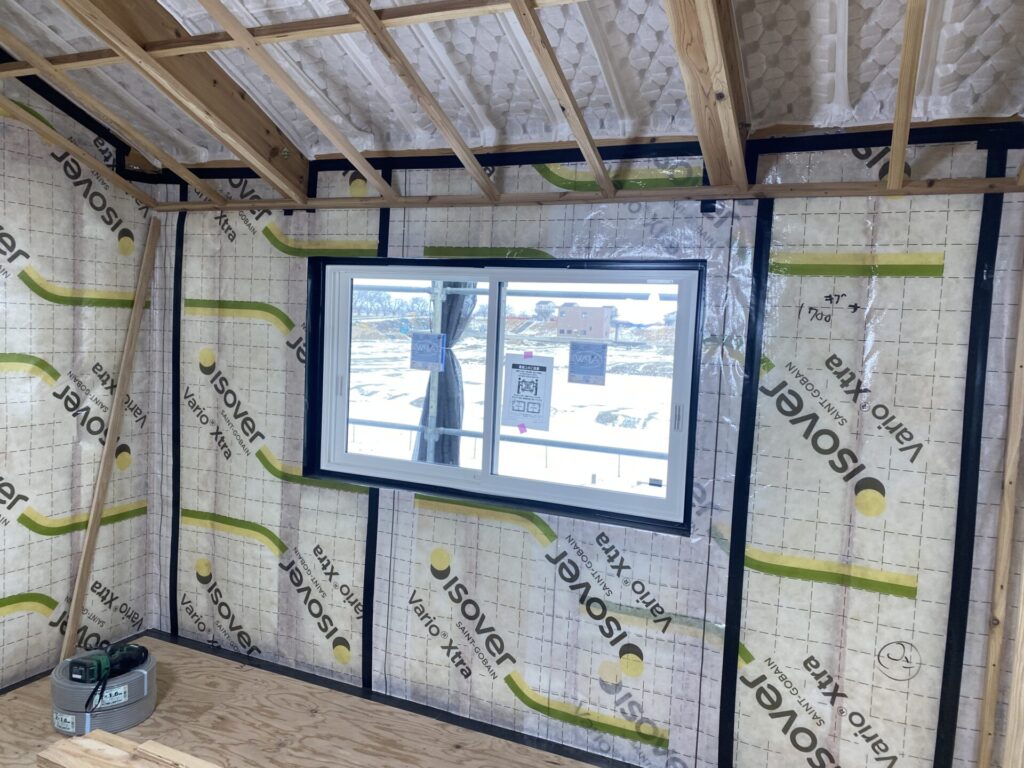 2階天井は通気層確保のためのスペーサーを取り付け、セルロースファイバー吹込みの準備をしています。壁は1,2階ともにグラスウールの断熱材を充填し、気密シートの施工を進めています。