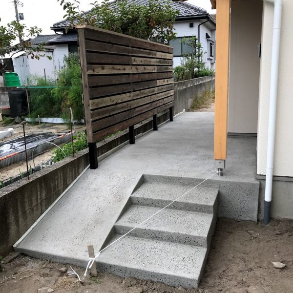 東区の現場ですが、中庭スペースの囲いと玄関先の目隠しが完成しました。