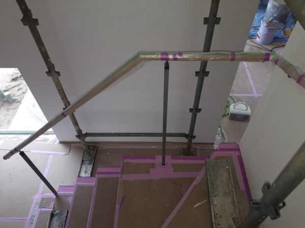 廻階段に設けられた造作タモ材とスチールの支柱にて構成する手摺