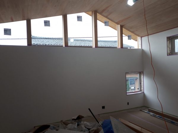 写真は竣工を控え 今左官職人さんが漆喰の仕上作業を進める建物です