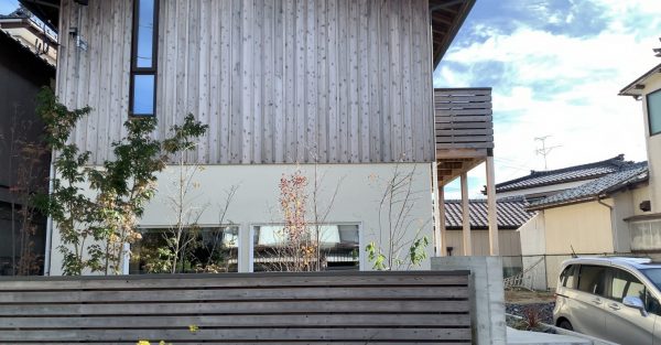 向陽の家は築1年で1階の外壁がジョリパット吹き付け仕上げで2階は杉板