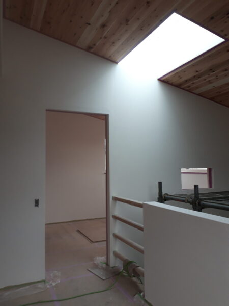 内壁仕上を迎えた吹き抜けに面する2階ホール