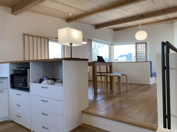 キッチン、ダイニング、リビングと勾配天井となっていますので圧迫感は無く、