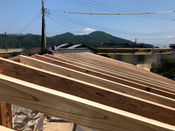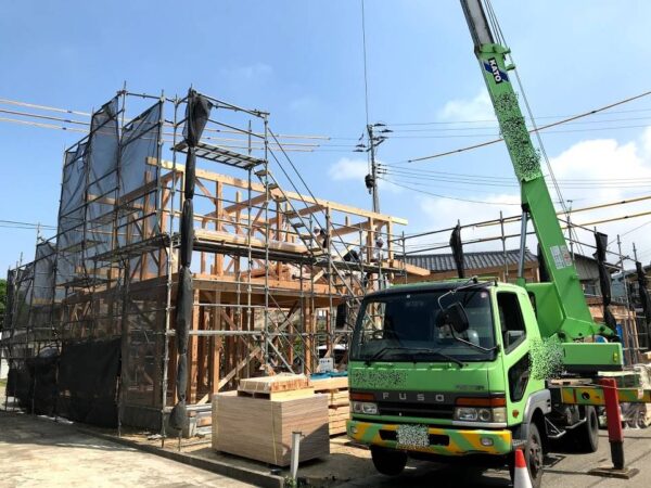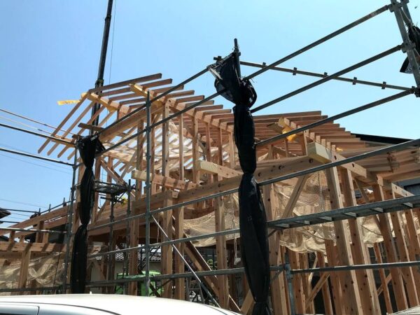 天候も次第に回復し、雲一つない晴天のなか、順調に建て方が進みました。