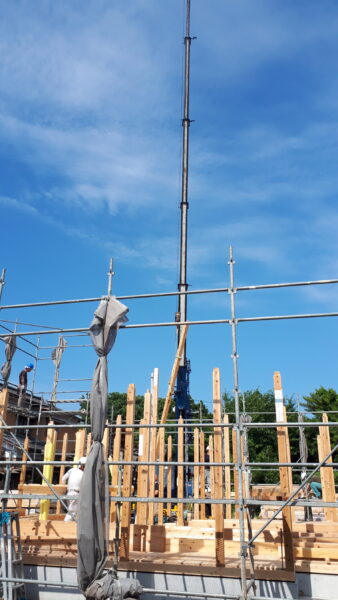 早朝より1階通し柱 管柱から建て上げて梁を渡し