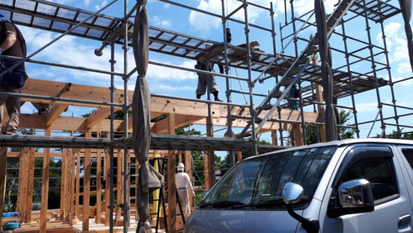 里山近くに位置する緑豊かな環境での上棟を