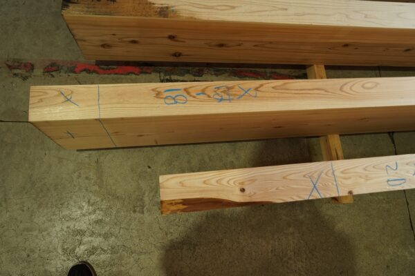 現しの梁を並べ、一本ずつ四面を確認しています
