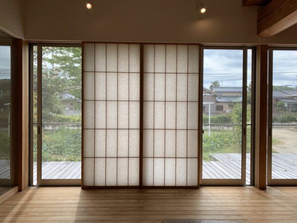 広間の障子は窓のサイズが高いために障子の桟は均等に配置されいます。
