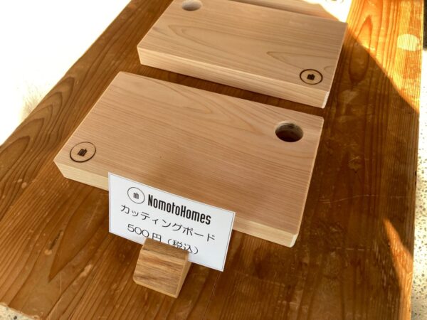 ノモトホームズのブースでは、国産桧でつくったカッティングボード、
