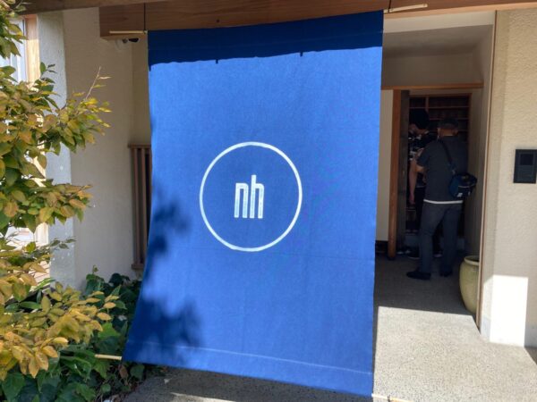 モデルハウスの玄関には、越前浜在住の植物染職人、星名さんに昨年染めていただいた