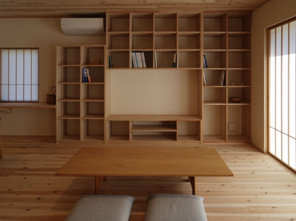 リビングにはお客様のこだわりの造作の本棚兼テレビ台があり、とても迫力があります。