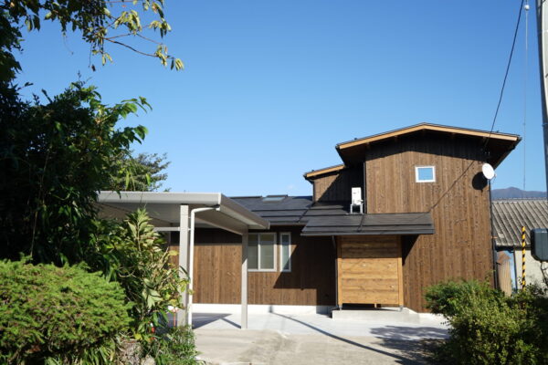 外壁には焼杉を使い、緑の多い宮古木の周辺環境にマッチしています。軒が深く出ており、