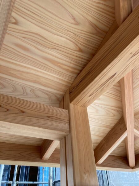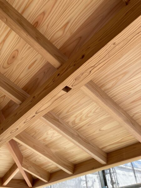 柱、梁、垂木、軒天井が複雑に阿絡み合う部分ですが、隙間がほぼありません。