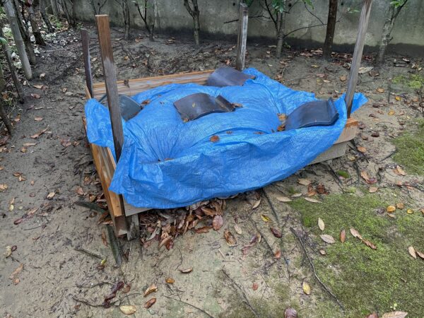 飛んでいかないようにビニールシートをかぶせています。