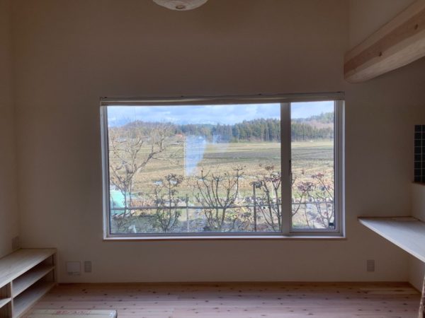 広間から見える豊かな田園の平野が続 その先に山々の稜線を