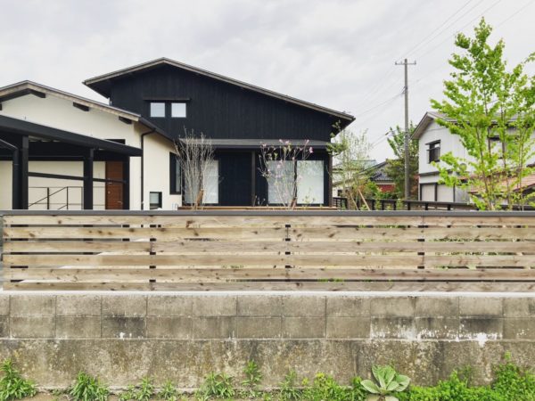 外壁は焼杉板と吹付塗装の2パターンの組み合わせ。