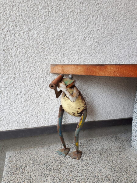 玄関ベンチ横に置かれたブリキのカエルどちらもセンスの良さが
