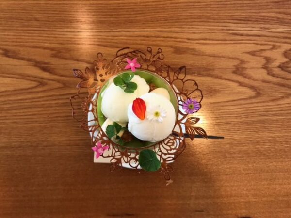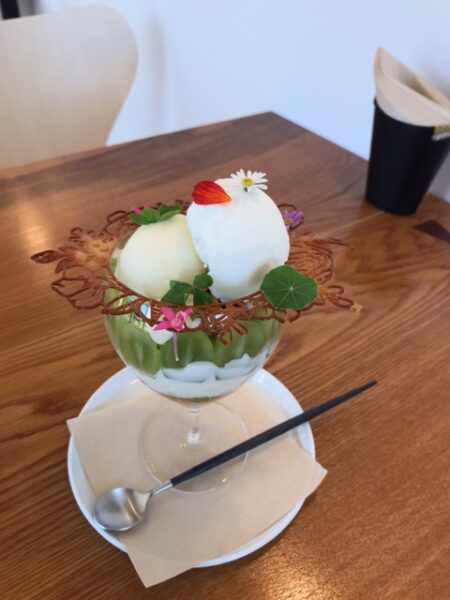 緑色と花の彩り豊かなパフェです。