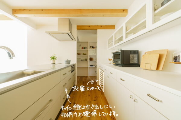 ゴミ箱のスペースを作り、キッチン部分はオープンの