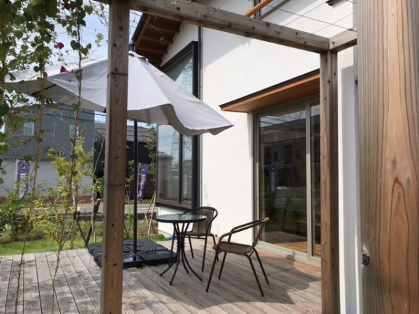 今日の鳥屋野南モデルハウスでは、デッキ部分にテーブルと椅子が出ています。