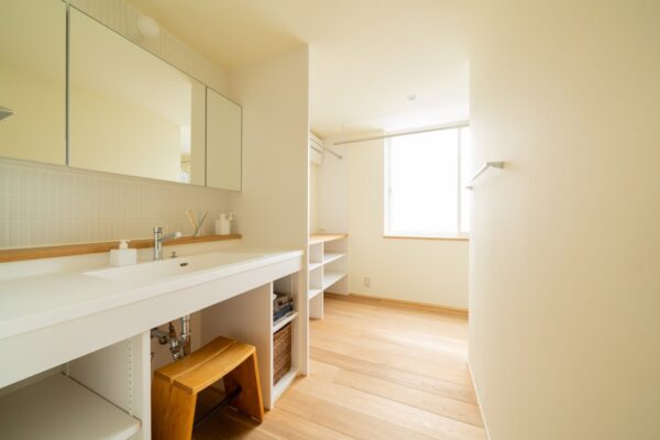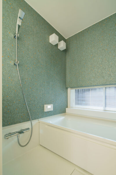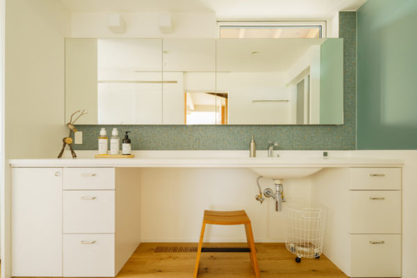 洗面脱衣室と浴室には同じタイルを使い、部屋と部屋で区切るのではなく
