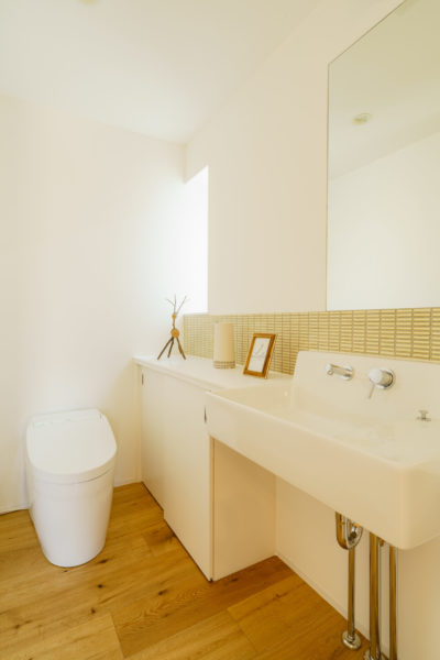 『鳥屋野南モデルハウス』では洗面脱衣室、トイレ、浴室にタイルを張っております。