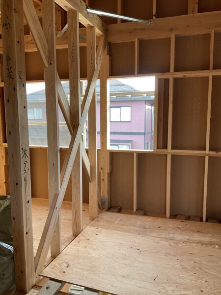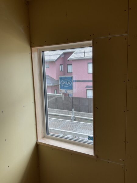 この写真は建て方後に窓開口の下地を組んだところです。