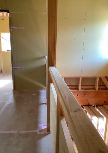 その進捗現場にて 仕上げられた吹抜けに面した柔らかな面取りを