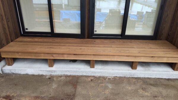 施工の際に気を付けていることがいくつかあります。木材は水に弱いので外壁との取り合いや床材間に隙間を4~5mm程度空けるようにしてますし、束と土間が直接取合わないように束下にパッキンを敷いてます。又、床材を固定するビスの通りが、まっすぐになるように気を付けてますし、束と土間を固定する金具を見せないように取付ける位置にも気を付けています。