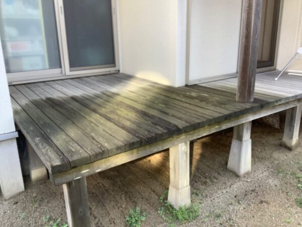 デッキ材のメンテナンスでは日射しや雨、風の状況下によっては4~5年で劣化が進行する場合もありメンテナンスの仕方については年数が経って表面の汚れ黒ずみが濃くなてき出したり、薄い緑色を帯びたなと気付かれたらデッキブラシなどで気候の良い季節に綺麗に洗い流しておくだけでもデッキ持ちは格段変わります。