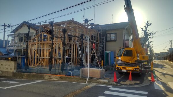 中央区に建築中の現場ですが、先週建方を行いました。大工さん5人で作業しまして、上屋の野地板まで敷き終わりました。これから造作工事をメインに工事を進めていきますが、良い建物ができるように調整して行こうと思います。