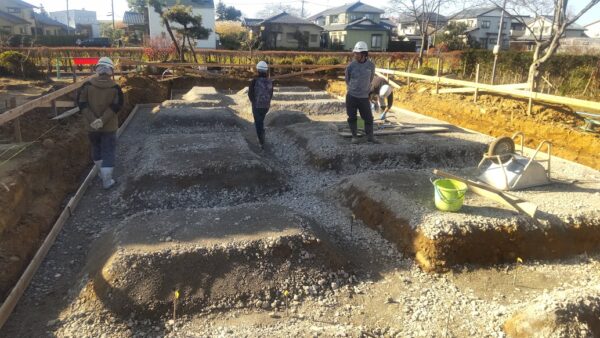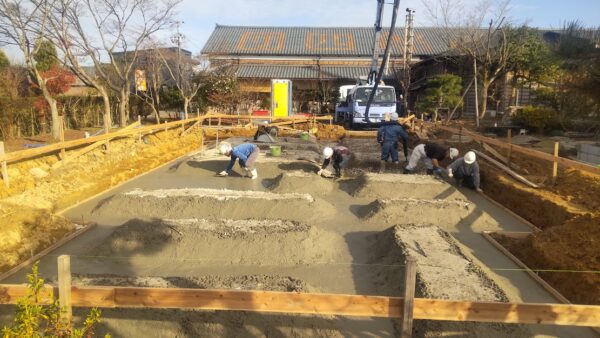 根切り・砕石敷きも完了しまして、捨コン打設前の状況です。外周に設置された板は捨コン止め枠ですが、コンクリートの天端高さの墨をだしておきまして、ポンプ車ホースからコンクリートをだす際に目安として、またコンクリートを均す際に高さを合わせていきます。内部には鉄筋棒を打込んでコンクリートの天端をだしておき、先程と同じように目安や均す際に使用して、終わった所より取り除いていきます。