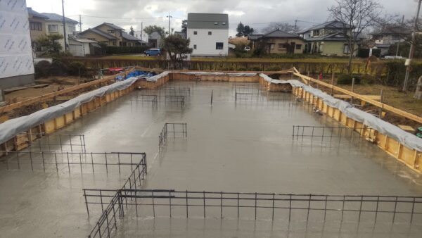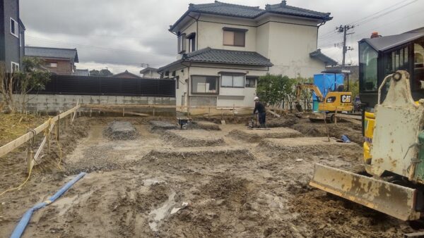 こちらは、現在基礎工事を行っている西蒲区の現場ですが、根切り・砕石敷きの作業を昨日終了しまして、捨コン打設を本日行いました。捨コンは型枠用の墨出しや型枠の固定や一体打ちの受け金具の固定以外にも鉄筋のかぶり厚さの確保や、のり面が崩れないようにするために必要です。冬場の作業で天候が心配ですが、工事がスムーズに進められるように基礎業者さんと調整して行こうと思います。