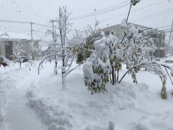綺麗な花も雪の下。木の枝にも雪が積もって、とても重たそうです。枝は折れてしまったものもあったようです。午後からは男性陣が総出で雪かきをしています。私は事務所に残り、皆さんの姿を見て応援です。応援するしかありません。皆さん、ありがとうございます!
