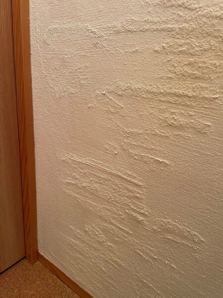 住んで15年経過した我が家も、よく見ると床上1mくらいの所に所々汚れが目立ちはじめました。お正月の休みに漆喰のメンテナスをしてみました。