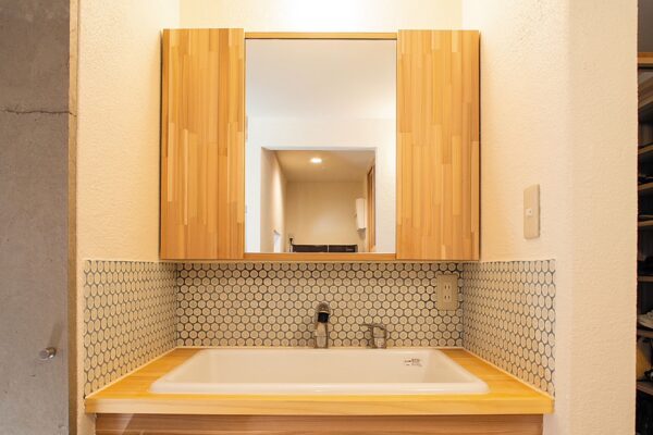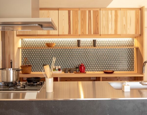 こちらは造作カップボードのに施した七宝紋をモチーフしたモザイクタイル。