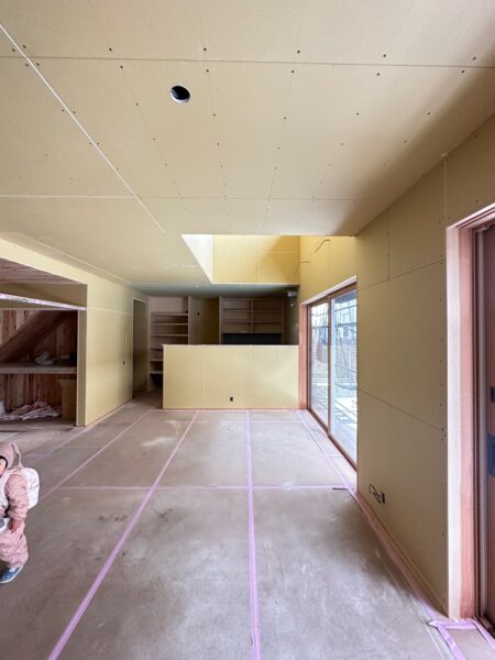 こちらの写真は先月、漆喰塗装前の現場を建主さまにご確認いただいた際の写真です。お子さんがかわいらしくちょこっと写っていますね。最初に家づくりのご相談を受けてお打合せさせていただいたときはもっと小さかったので、お子さんの成長を嬉しく思いながらも、もう間もなく竣工かぁと思うと、寂しくもなりますね。竣工まで残り1か月ですが、建物完成という一つのゴールに向けて、ラストスパート!といったところです。