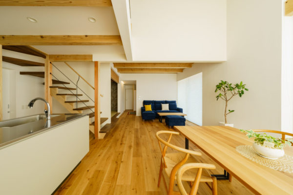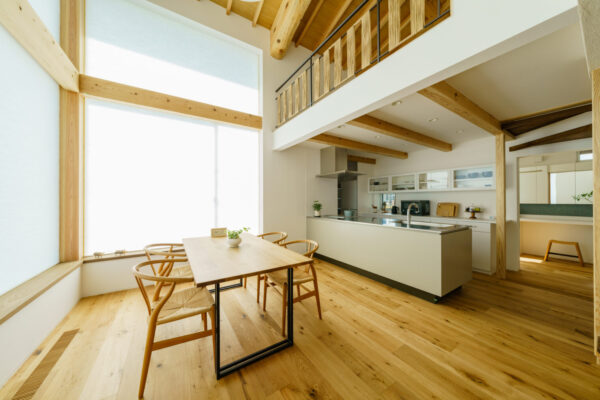 こちらの写真は「鳥屋野南モデルハウス」の写真です。リビング・ダイニングの開口部からキッチンの開口部へと南北に風が抜けるように、