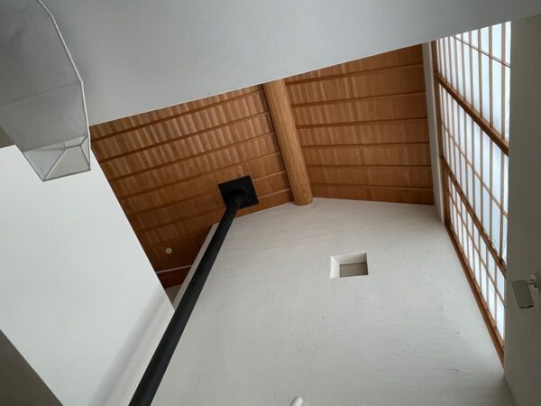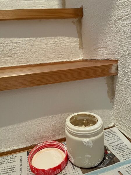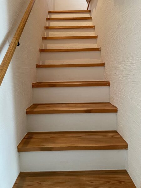 我が家の階段です。住み始めて15年経ちました。漆喰壁は自然素材でできているため、時間が経つとひび割れが生じることがあります。漆喰壁のひび割れ補修は簡単に行うことができます。
