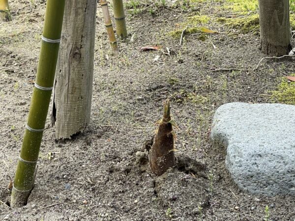我が家の竹の子が砂の中から顔を出しました。砂地に育っているので栄養が無いのでいつも大きくなれません ? 竹の子は育つように見守っていきます。