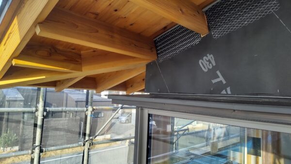 外装リシン掻き落とし仕上げを行う際に、木下地にフェルトを張りまして外壁の端部に見切り材を設置してからラスをタッカーにて固定していきます。軒天が野地板表しの場合は、垂木間に通気材を入れて外壁端部に見切り材を細かく取り付けていくのですが、左官職人さんが手際よく取り付けている姿を見て、さすがだなと思いました。ラス張りが終わると軽量モルタルにて中塗りを行い、養生期間後にリシン掻き落とし仕上げを行います。