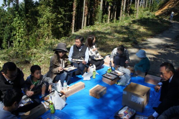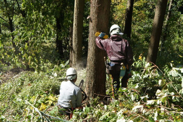 山に入って、実際に伐採する様子を見ていただきました。
