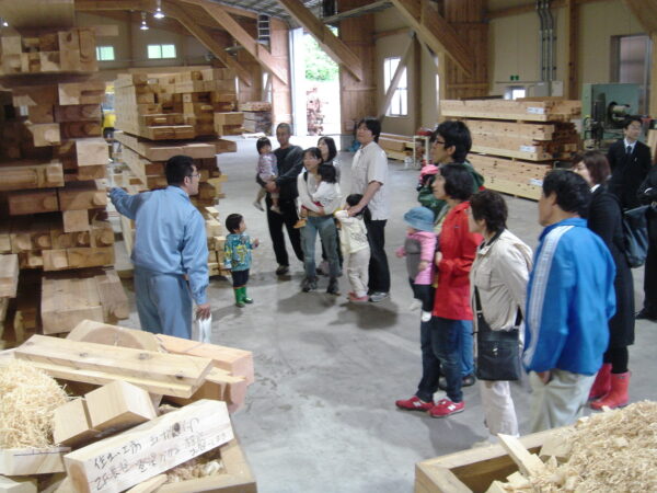 プレカット工場をご見学いただいています。左側に写る佐藤常務が若い!笑
