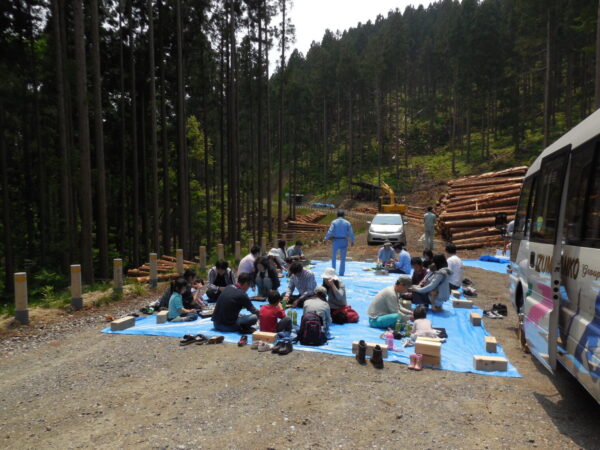 見学ツアーなので、バスをお借りしてご案内させていただきます。森林の中で食べるお昼ごはんが、本当に最高なんです!