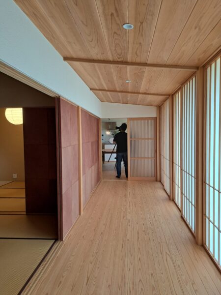 玄関を上がり二間続の和室前、庭に面したこの廊下にもまた月日の流れを感じさせながらも整えられた繊細な収まりが見せるこの空間もまた色あせることのない大変