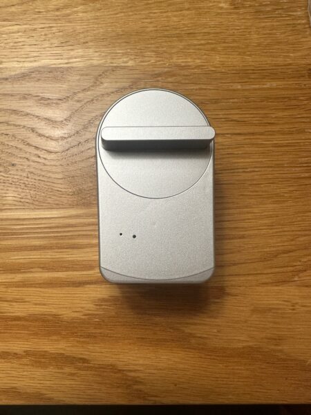 これがSESAME5の本体です。樹脂製で中に電池が2本入っています。色はもともとブラックとホワイトの2色展開だったのですが、シルバーが7月に発売になったので、玄関ドアのハンドルに合わせてシルバーを選びました。